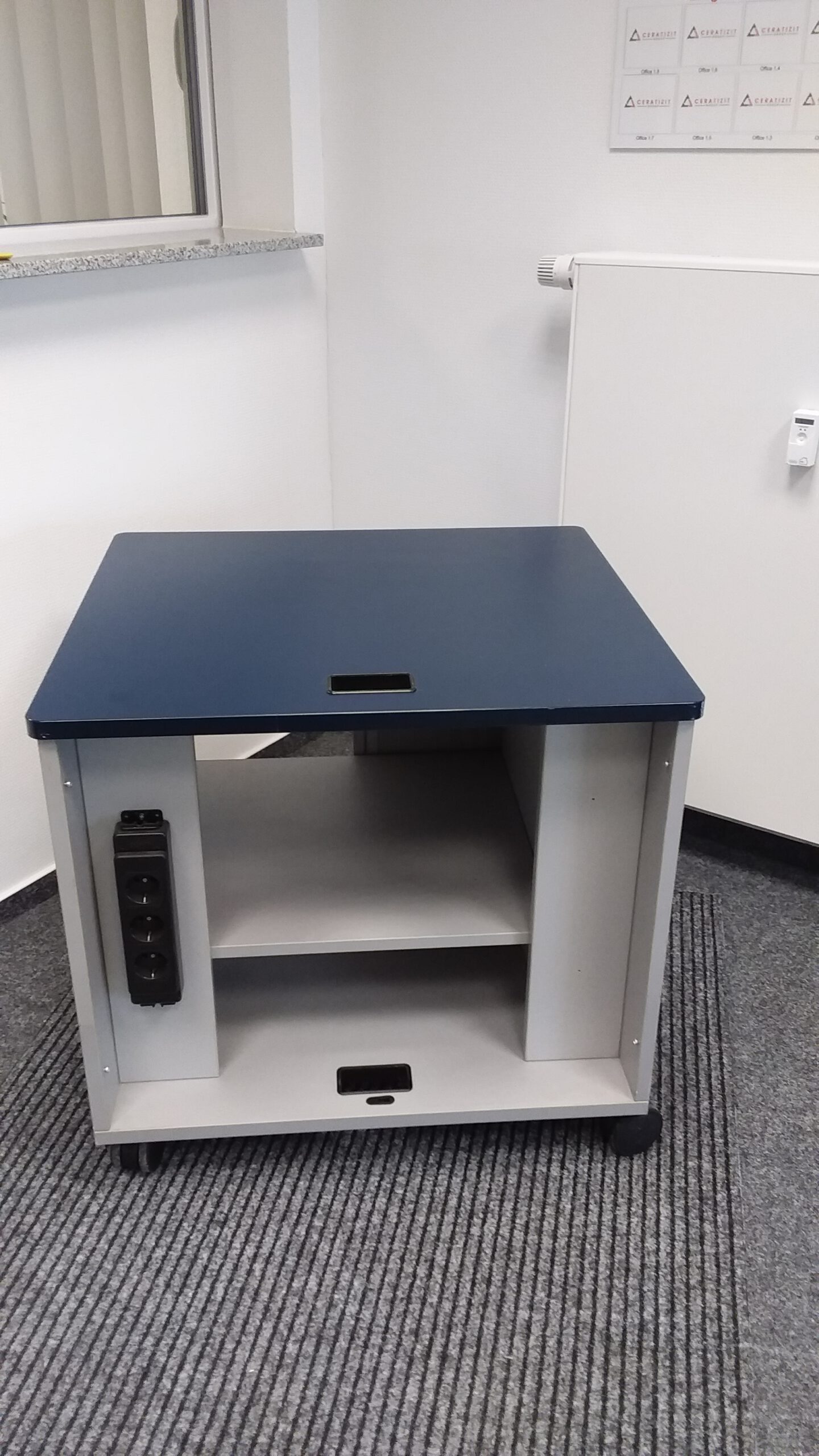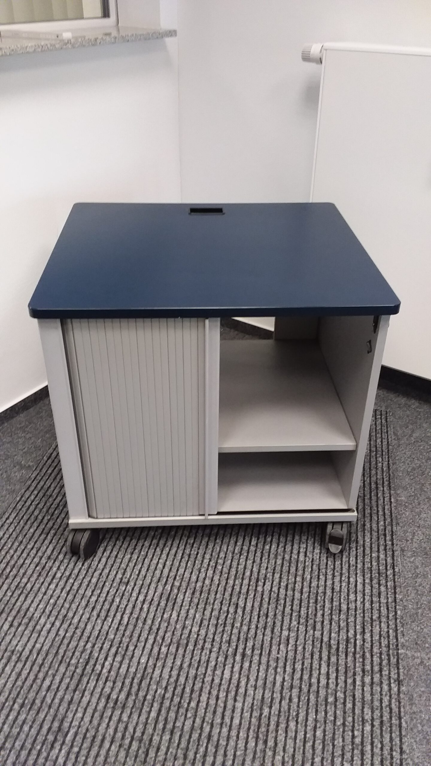 Aktenschrank mit Rolltür, rollbar, grau/blau, mit Steckdosenleiste